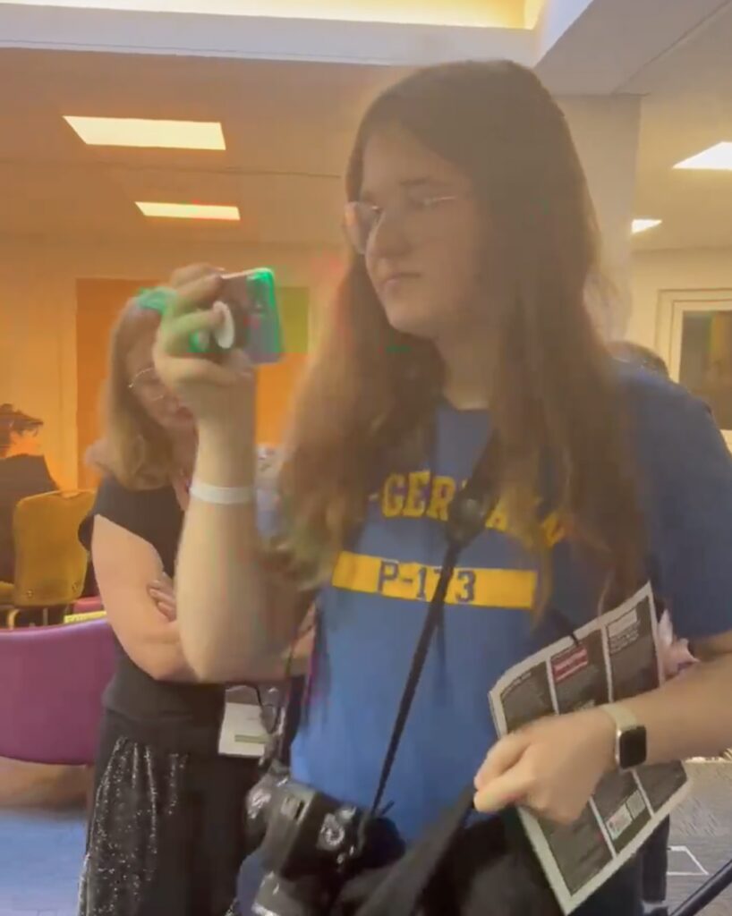 Still outside the venue, Brooks approached him while filming and asked, โWhy do you think it is acceptable to call teenagers domestic terrorists?โ She did not pose any physical threat. She was not committing any crime that needed disrupting. She was, rather asking him to account for his defamatory and abusive posts about her.