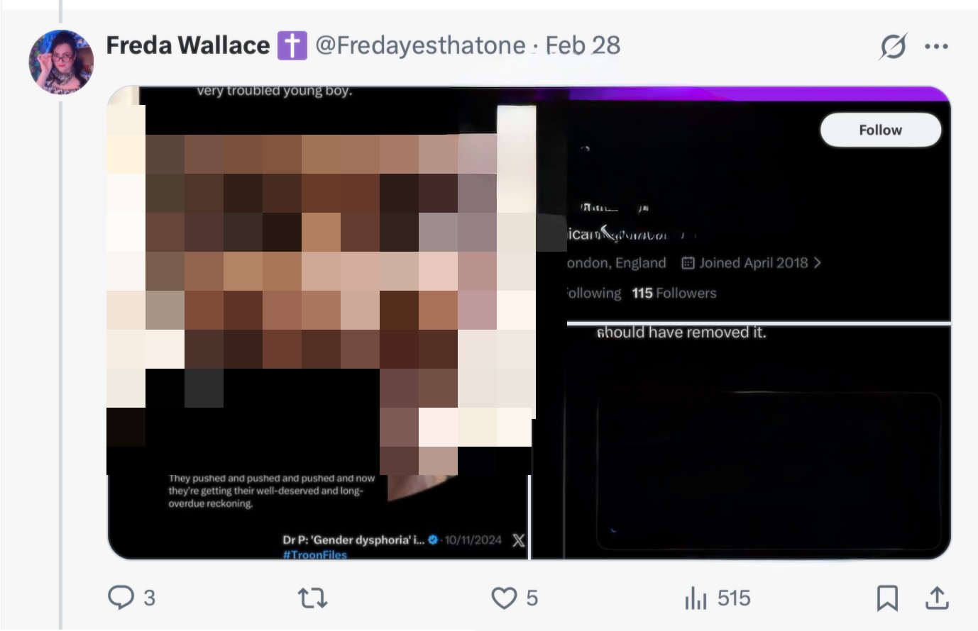 Now Dr P’s been doxxed. Two TRA accounts, one belonging to Freda Wallace, have posted a photo of Dr P, her full name, and, most worryingly, her home postcode. Dr P asked X to remove the tweets. It refused, so last week Dr P made a written complaint to the Metropolitan police using an online form. Dr P told the Met she wanted someone to have a word with Wallace and get him to take his posts down. Dr P is worried that one or more TRAs might use the information Wallace posted to target her home. “These men… are dangerous,” she says. “They are violent. A lot of them are psychopaths…. and I’m particularly worried because my daughter is disabled. And I just, I just thought, if they firebomb my house or something – how do we get her out, you know?”